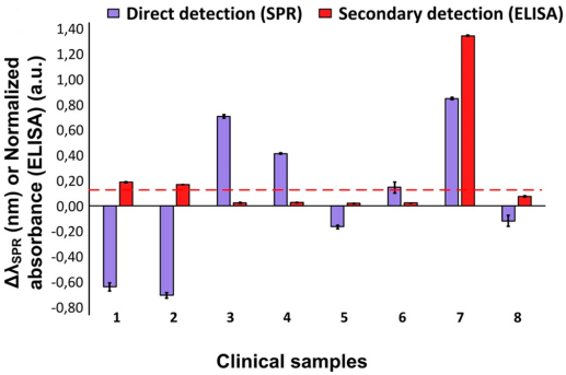 可能是樣品本身的異質(zhì)性(不透明度、色素等)及檢測(cè)方法亟待完善,如圖4所示,初始直接法獲得的SPR結(jié)果與ELISA結(jié)果也有顯著差異;8個(gè)樣本中,只有3個(gè)樣本的SPR結(jié)果與ELISA檢測(cè)有相關(guān)性。
