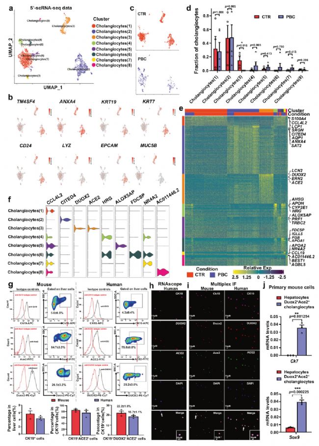由于PBC的特點(diǎn)是選擇性破壞小BECs,作者進(jìn)一步分析了膽管細(xì)胞。結(jié)果發(fā)現(xiàn)膽管細(xì)胞共分為8個(gè)簇(圖2a-2b),其中膽管細(xì)胞簇(3)僅在對(duì)照組中被檢測(cè)到,而未在PBC肝臟中檢測(cè)到(圖2c-2d)。此外,膽管細(xì)胞簇(3)的雙氧化酶2 (DUOX2)和血管緊張素轉(zhuǎn)換酶2 (ACE2)呈現(xiàn)高表達(dá)的狀態(tài)(在其他膽管細(xì)胞簇中表達(dá)非常低)(圖2e-2f),這表明人類肝臟中有一個(gè)獨(dú)特的膽管細(xì)胞亞群是PBC的潛在靶點(diǎn)。接下來(lái),作者通過(guò)流式細(xì)胞分選、RNAscope、qPCR等方法證實(shí)肝細(xì)胞高表達(dá)CK19、DUOX2和ACE2,且高表達(dá)膽管細(xì)胞特異性標(biāo)記物、高表達(dá)小膽管細(xì)胞的標(biāo)記基因(圖2g-2j),故作者將膽管細(xì)胞簇(3)定義為DUOX2+ACE2+膽管細(xì)胞。