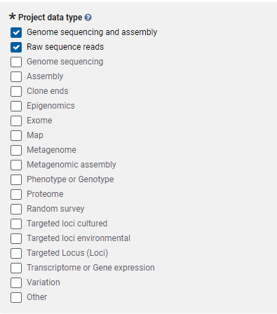 Project Type 界面,選擇 Raw sequence reads,有組裝數(shù)據(jù)的也選擇 Genome sequencing and assembly;Sample scope 有 5 類(lèi)選擇:?jiǎn)我粯颖,多個(gè)樣本,多物種,環(huán)境樣本,合成樣本等,可按照實(shí)際點(diǎn)擊,其中普通轉(zhuǎn)錄組選擇:Multiisolate;微生物多樣性或宏基因選擇Environment;