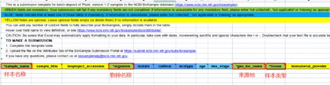 這里需要注意一下表頭的顏色,其中綠色為必填項(xiàng),藍(lán)色為選填項(xiàng),黃色為非填項(xiàng)。如果綠色的任何必填字段的信息不可用,可輸入“not collected”、“not applicable”或“missing”替代。藍(lán)色雖為選填項(xiàng),但至少填寫(xiě)一個(gè),同樣出現(xiàn)何必填字段的信息不可用,請(qǐng)輸入“not collected”、“not applicable”或“missing”替代。黃色可以不予填寫(xiě)。每一個(gè)單元格填寫(xiě)是有格式要求的,可以點(diǎn)擊需要填寫(xiě)的列名查看具體格式!