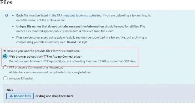 Files界面:數(shù)據(jù)上傳的選擇方式,若單個(gè)文件數(shù)據(jù)量小于10G,樣本數(shù)小于300個(gè),我們推薦Aspera方式上傳(如下圖);