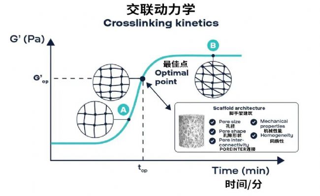 根據(jù)剪切儲(chǔ)能模量(G'),水凝膠的交聯(lián)動(dòng)力學(xué)。聚合物鏈之間的相互作用數(shù)量隨著時(shí)間的推移而增加,(G’)也隨之增加。最佳的干燥支架取決于啟動(dòng)冷凍干燥過(guò)程時(shí)水凝膠的硬度。