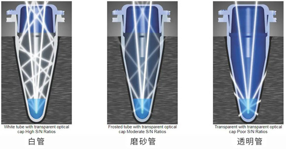 然而,如圖1所示,與其他管材相比,白管管壁不透明,幾乎沒(méi)有信號(hào)丟失,且隔絕了樣品臺(tái)污染的熒光信號(hào)干擾,減少了相同樣本孔間差異。