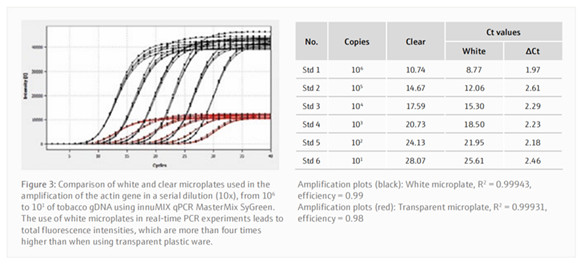 如上圖,qPCR使用透明和白色耗材的結(jié)果比較: