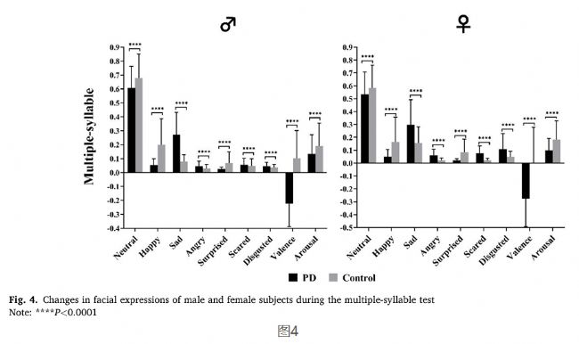 在多音節(jié)測試中,我們獲得了與單音節(jié)和雙音節(jié)測試相似的所有面部表情結(jié)果(圖 4)。 此外,與帕金森組相比,健康對(duì)照組組在中性情緒、快樂、驚訝、效價(jià)和喚醒方面的得分顯著更高,而在消極情緒(悲傷、憤怒、恐懼和厭惡)方面的得分顯著降低(P <0.0001) .