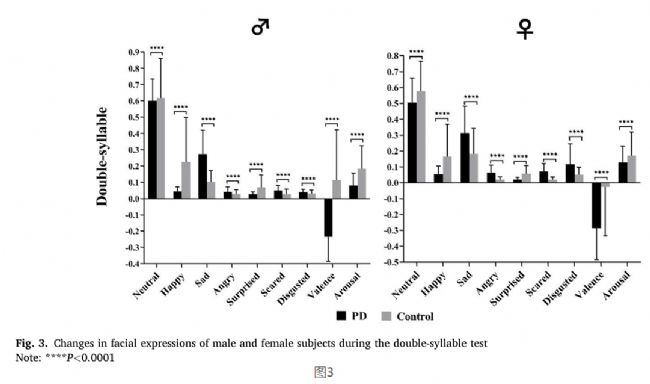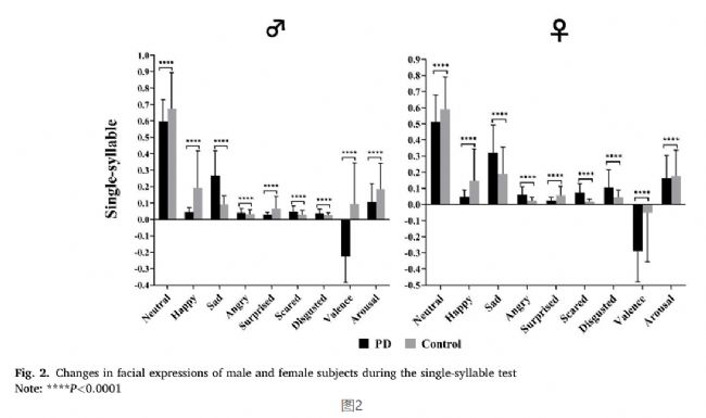 在單音節(jié)測試中,男性帕金森患者的中性情緒、快樂、驚訝、效價(jià)和覺醒的面部表情評(píng)分顯著低于健康男性受試者(P <0.0001;圖 2)。相比之下,帕金森患者的悲傷、憤怒、恐懼和厭惡的表達(dá)明顯高于健康對(duì)照組的男性被試者(P <0.0001)。 同樣,女性患者在中性情緒、快樂、驚訝、效價(jià)和喚醒的面部表情方面的得分明顯低于健康女性受試者的相應(yīng)得分。此外,帕金森女性患者的悲傷、憤怒、恐懼和厭惡的表達(dá)得分顯著高于健康對(duì)照組。