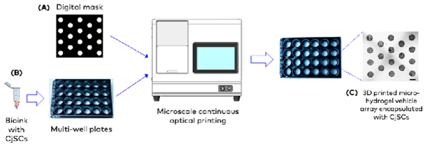 Fig 2.3D bioprinted CjSCs encapsulated 3D micro-hydrogel vehicles with adjustable exposure time and properties.