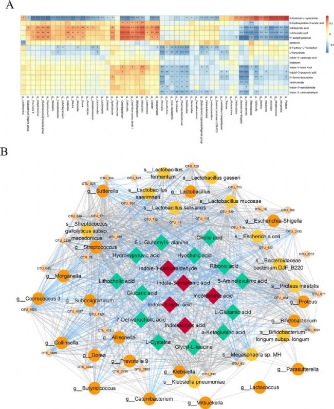 圖3 受水蘇糖調(diào)控的色氨酸代謝物與微生物的 Spearman 相關(guān)性
