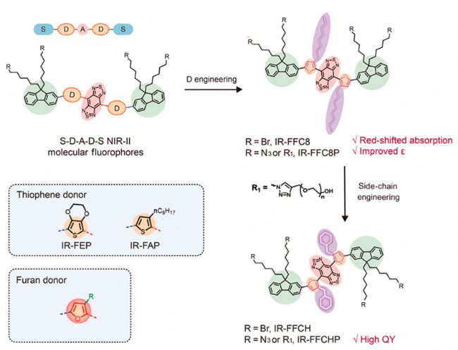 背景:近紅外二區(qū)(NIR-II,1,000到1,700 nm)熒光成像具有更深的穿透力和更高的信噪比,是一種有前景的生物成像技術(shù),NIR-II熒光探針是實(shí)現(xiàn)高性能成像的關(guān)鍵,但目前的探針亮度通常不高,吸收和發(fā)射波長(zhǎng)不夠長(zhǎng)。有機(jī)NIR-II熒光探針中,具有D-A-D共軛骨架的分子具有優(yōu)異的光穩(wěn)定性和易調(diào)節(jié)的光物理性質(zhì)。D單元對(duì)于調(diào)節(jié)分子的吸收或發(fā)射波長(zhǎng)、量子產(chǎn)率和吸收系數(shù)等性質(zhì)有重要影響,但目前大多使用噻吩衍生物作為D單元,而噻吩衍生物作為D單元可能導(dǎo)致分子在水溶液中發(fā)生藍(lán)移或量子產(chǎn)率降低。本文首次采用呋喃作為D單元構(gòu)建NIR-II熒光探針,并通過(guò)精細(xì)設(shè)計(jì)側(cè)鏈提高了分子在水溶液中的亮度和穩(wěn)定性。