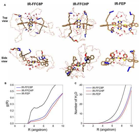 Figure 2 為根據(jù)分子動(dòng)力學(xué)模擬,水和熒光團(tuán)在水中的相互作用示意圖,展示不同的熒光分子在水溶液中與水分子的相互作用,通過(guò)分子動(dòng)力學(xué)模擬計(jì)算。熒光分子包含一個(gè)BBTD(雙苯并噻二唑)受體單元和兩個(gè)呋喃或噻吩供體單元,以及一個(gè)PEG(聚乙二醇)鏈。圖中顯示了水分子的氧原子圍繞BBTD核心的徑向分布函數(shù)(RDF),以及BBTD周?chē)乃肿訑?shù)量。結(jié)果表明,呋喃供體單元可以減少水分子與BBTD核心的相互作用,從而提高熒光量子產(chǎn)率和熒光穩(wěn)定性。