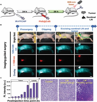 Figure 5 介紹了一種利用雙色近紅外二區(qū)(NIR-II,1000-1700 nm)熒光成像技術(shù)指導(dǎo)腫瘤和淋巴結(jié)切除手術(shù)的方法。展示用IR-FFCHP和PdS/CdS實(shí)現(xiàn)雙色NIR-II成像的效果,可以同時(shí)定位腫瘤和淋巴結(jié)。結(jié)果顯示,通過(guò)不同的濾波器,可以清晰地區(qū)分出左右兩只腳注射的熒光團(tuán),并且觀察到淋巴結(jié)在NIR-IIb通道下有較強(qiáng)的信號(hào)。這表明了IR-FFCHP和PdS/CdS可以用于腫瘤和淋巴結(jié)的雙色NIR-II成像和導(dǎo)航手術(shù)。