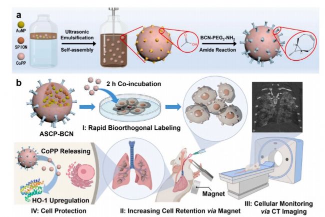 針對上述問題,中國科學院上海硅酸鹽研究所陳航榕研究員和馬明副研究員團隊利用“金屬卟啉誘導多尺度自組裝”策略構(gòu)建了一種新型多功能探針,用于輔助干細胞治療。該復合探針由具有臨床應用潛力的原卟啉氯化鈷(CoPP)、金納米顆粒和超順磁Fe3O4納米顆粒三種功能組分構(gòu)成,并借助無銅點擊化學實現(xiàn)對干細胞的高效生物正交標記。該自組裝納米探針無需借助額外載體和表面活性劑,可在較低劑量下有效發(fā)揮每個組分的相應功能。具體來說,該納米探針所具有的CT造影成像和磁操控兩種功能分別解決了干細胞在肺部難以監(jiān)測和滯留時間短的問題;探針在干細胞微環(huán)境中通過緩釋抗氧化藥物CoPP有效提高干細胞的存活率和修復效果等。通過進一步構(gòu)建肺纖維化小動物模型,證實了相較于單獨干細胞治療組,這種多功能自組裝納米探針介導的干細胞治療能夠顯著緩解纖維化癥狀并促進肺功能恢復,具有良好的臨床應用潛力。