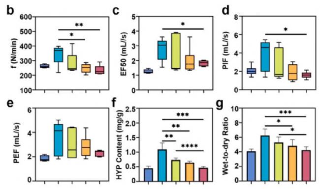 為了評估ASCP-BCN標記的骨髓間充質(zhì)干細胞在PF治療中的可行性,實驗采用了博萊霉素(BLM)誘導小鼠PF模型。BLM干預導致小鼠肺功能顯著降低,表現(xiàn)為每分鐘呼吸量(MV)的增加、50%肺活量下的呼氣流量(EF50)、吸氣流量峰值(PIF)和呼氣流量峰值(PEF)的增加。骨髓間充質(zhì)干細胞移植后可輕微降低上述肺功能參數(shù),ASCP-BCN標記的骨髓間充質(zhì)干細胞移植和磁吸引進一步減輕上述肺功能參數(shù),說明其在促進骨髓間充質(zhì)干細胞治療效果中發(fā)揮重要作用。特別是,ASCP-BCN標記的MSCs +磁操作移植組小鼠的呼吸頻率和吸氣流量峰值幾乎達到了對照組小鼠。更重要的是,標記間充質(zhì)干細胞移植和磁操作不僅降低了纖維化肺中的羥脯氨酸(HYP)濃度,而且降低了炎癥引起的肺濕干比。