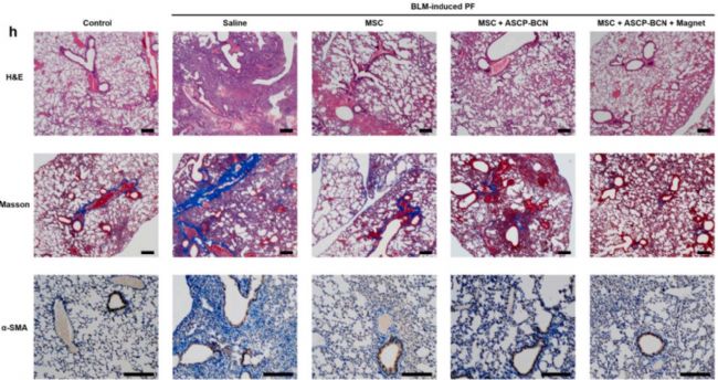36只雄性C57BL/6小鼠適應1周,隨機分為6組: (1)對照,(2) PF,(3) PF +生理鹽水,(4) PF + MSC,(5) PF + ASCP-BCN標記MSC,(6) PF + ASCP-BCN標記MSC +磁鐵(n = 6)。 用博萊霉素(BLM)誘導肺纖維化。簡單地說,小鼠被麻醉,將BLM(5 mg/kg)溶于100μL無菌生理鹽水中,通過氣管插管緩慢注入氣管腔。生理鹽水組小鼠僅給予100μL無菌生理鹽水。給藥后第7天重復上述步驟。將未標記的間充質(zhì)干細胞和標記的間充質(zhì)干細胞(每只小鼠1×106個細胞)放在100 μL生理鹽水中,在第一次注射BLM后第10天氣管內(nèi)移植到小鼠肺中。在PF + ASCP-BCN標記的MSC +磁體組中,每只小鼠的胸部都附著一個NdFeB磁體。第一次注射BLM后第28天處死小鼠,取肺組織。