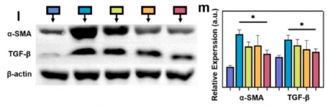 (l)肺組織中α-SMA和TGF-β的免疫blot分析,(m)相應的α-SMA和TGF-β蛋白的相對表達水平。