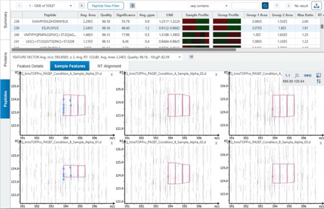 PEAKS的蛋白相對定量是基于MS1中的離子峰強度信息。在非標記定量(Label-Free)實驗中,樣品通常單獨分開收集進行處理及LC-MS/MS分析。針對實驗結(jié)果中的大量數(shù)據(jù),PEAKS在離子峰自動對準和比較方面采取了靈敏并精確的算法。通過數(shù)據(jù)庫搜索得到的MS2中的蛋白質(zhì)/肽段定性信息也整合進蛋白質(zhì)的定量分析中。