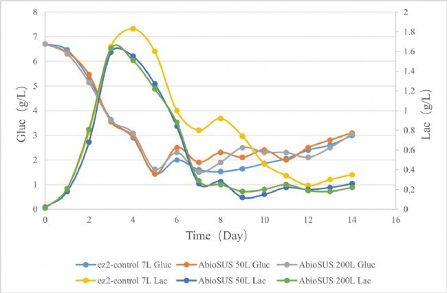 該研究的結(jié)果表明, 不同規(guī)格的AbioSUS™一次性生物反應(yīng)器均能支持CHO-K1進(jìn)行Feed-Batch培養(yǎng),達(dá)到預(yù)期的VCD的同時(shí)還能保持高活率,而且通過補(bǔ)料控制將葡萄糖和乳酸控制在一定的水平。