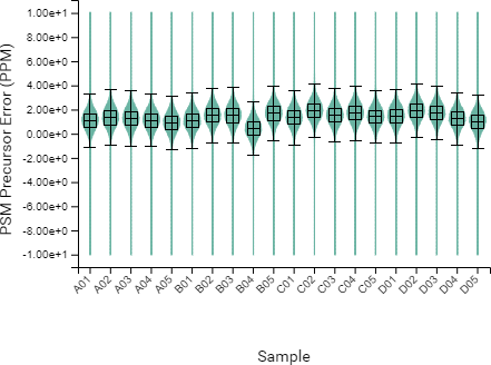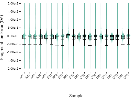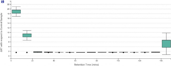 DIA QC工作流程還以箱型圖的方式展示了LC梯度上所有樣品中肽段的洗脫時間與特定對照品保留時間或者與所有樣品的平均保留時間的差異。