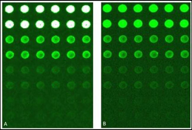 圖 2. 動(dòng)態(tài)范圍擴(kuò)展 (XDR)。為了解決樣品間蛋白質(zhì)表達(dá)水平差異大的問(wèn)題,Innopsys 開(kāi)發(fā)了一種掃描模式,可以在保持微弱信號(hào)的同時(shí)避信號(hào)飽和。 A) 以手動(dòng)模式掃描的 RPPA 芯片;圖像是動(dòng)態(tài)范圍為 10