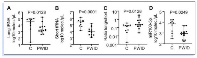 ▲圖1.男性長期使用阿片類藥物導(dǎo)致精子中tRF-Gly亞型比例的變化,使用naica®微滴芯片數(shù)字PCR技術(shù)定量tRFs。成熟精子細(xì)胞通過45-90% Percoll梯度純化,并使用核苷素試劑盒分離小RNA。cDNA使用一種特定的莖環(huán)RT引物與“長”tsRNA亞型(53個(gè)核苷酸長)或另一種靶向“短”tsRNA變體(32個(gè)核苷酸長)的特定RT引物生成。(A)每微升cDNA中“長”tRF Gly-GCC亞型的濃度。(B)每微升cDNA中“短”tRF Gly-GCC亞型的濃度。(C)“長”與“短”tRF Gly-GCC亞型的比例。(D)每微升cDNA中miR100-5p的濃度。“C”:對(duì)照組(不注射藥品的男性);“PWID”:阿片藥物注射組。P值通過單尾曼-惠特尼U檢驗(yàn)計(jì)算。對(duì)照組:n=10,PWID組:n=13。