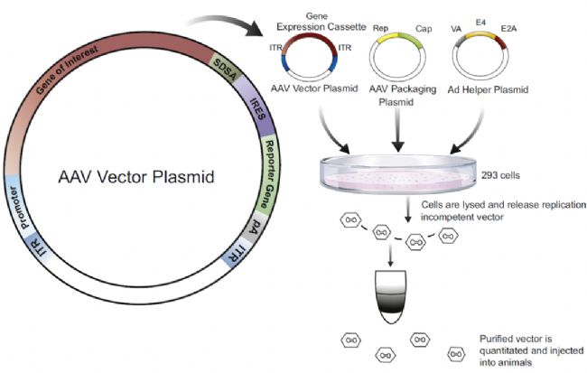 腺相關(guān)病毒是48KB單鏈的DNA,基因組包括Rep編碼的AAV生命周期相關(guān)蛋白 、Cap編碼的AAV衣殼蛋白兩個開放閱讀框,另外需要helper plasmid編碼AAV復(fù)制相關(guān)蛋白,待三個質(zhì)粒全部轉(zhuǎn)染進入HEK293細胞后,便可包裝成為具有感染能力,但無復(fù)制能力的AAV病毒顆粒。