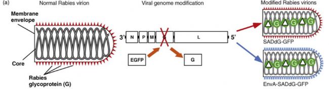 狂犬病毒不同于其它病毒載體,不可以作為廣普的病毒載體感染各類細胞。作為神經(jīng)科學(xué)研究的工具,狂犬病毒被應(yīng)用的點在于其神經(jīng)專嗜性(neurotropic viruses)。野生型狂犬病毒細胞內(nèi)高拷貝數(shù)具有細胞病毒,可逆行多級神經(jīng)元影響環(huán)路研究分析。產(chǎn)生移除糖蛋白G,重組SAD△G-GFP狂犬病毒不能逆行感染神經(jīng)元。后來通過產(chǎn)生引入外源膜蛋白EnVA重組EnVA-SAD△G-GFP特異感染表達受體TVA的細胞進行感染。