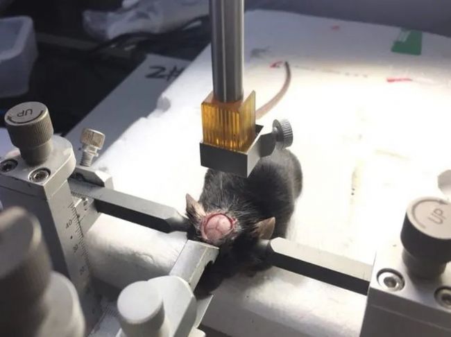 根據(jù)目標(biāo)腦區(qū)的立體定位圖譜坐標(biāo)進行調(diào)整,用顱骨鉆鉆開小鼠顱骨,用針尖挑破硬腦膜。
