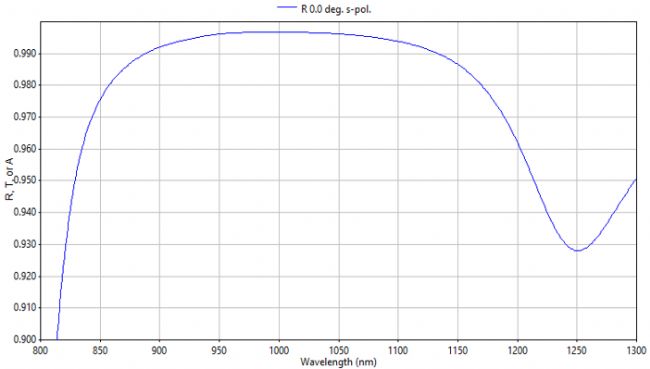 圖四:中心波長1000nm(工作波段900-1100nm)的介質(zhì)鏡反射率曲線(參考)
