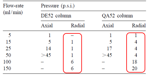 分別使用2種填料以相同流速測(cè)試傳統(tǒng)軸向工藝(Axial)和徑向工藝(Radial)的系統(tǒng)反壓, 對(duì)比列表如下:
