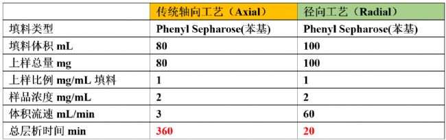 下表為徑向工藝和傳統(tǒng)軸向工藝疏水層析柱分離蛋白比對(duì)