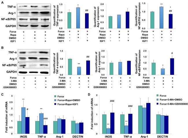 為了進一步確認調(diào)控機制,將AKT信號激活劑IGF1和抑制劑GSK690693應(yīng)用于THP-1衍生的巨噬細胞。 FS + Rapa+ DMSO組TNF-α和NF-κB/P65的表達量增加,IGF1應(yīng)用后降低(圖3 A)。未觀察到M2標記精氨酸酶-1的表達發(fā)生變化。在FS + Rapa+ DMSO組中,M1巨噬細胞相關(guān)標志物iNOS和TNF-α的mRNA水平一致升高,IGF1應(yīng)用后下降,而M2巨噬細胞相關(guān)標志物精氨酸酶-1和DECTIN-1 的mRNA表達無變化(圖3 C)。
