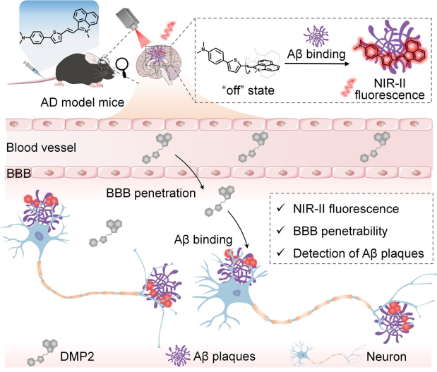 目前,用于Aβ蛋白的成像熒光探針有硫黃素T(ThT)和硫黃素S(ThS),但他們的發(fā)射波長短(480 nm),血腦屏障(BBB)穿透能力差,限制了它們的體內(nèi)應(yīng)用。此外,雖然有一些可激活的熒光探針用于Aβ蛋白的體內(nèi)成像,但這些探針的熒光發(fā)射通常位于NIR-I區(qū)(650–900 nm) ,穿透深度淺,信噪比(SNR)低,不適合腦組織成像。因此本文作者開發(fā)了NIR-II區(qū)(900–1700 nm)發(fā)射的可激活熒光探針用于Aβ蛋白的體內(nèi)成像(圖1)。