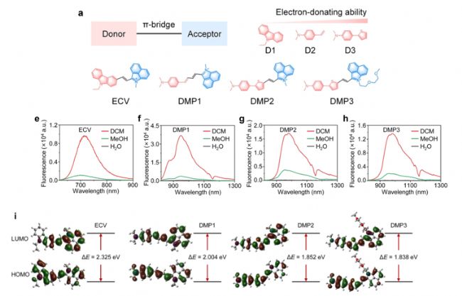 圖2. (a) 探針的分子結(jié)構(gòu) (e、f、g、h) ECV、DMP1、DMP2和DMP3探針在不同極性溶劑中的熒光光譜。(i) 探針在水中的HOMO-LUMO能極差。