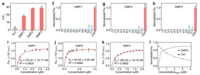 圖3. (e) 探針與Aβ聚集體結(jié)合后的熒光增強(qiáng)倍數(shù) (f、j、h) 探針在其他潛在干擾物存在時(shí)對(duì)Aβ聚集體的選擇性研究(1-10:潛在干擾物,離子、氨基酸和牛血清白蛋白等11:Aβ 單體) (i、j、k) PBS溶液中探針的結(jié)合親和力測(cè)定 (l) DMP2和ThT探針的競(jìng)爭(zhēng)置換實(shí)驗(yàn)。
