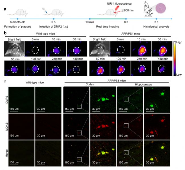 圖6 (a) DMP2探針的NIR-II熒光成像示意圖 (b)野生型小鼠和AD模型小鼠的活體腦成像 (f) Aβ單克隆抗體(MOAB)染色后的腦組織切片離體熒光圖像