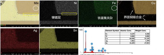 進一步結(jié)合 EDS 能譜面掃分析可知:銀-錫膏和銅面結(jié)合,界面有銅-錫為主合金化晶粒生長,銅引腳有鍍鎳層,并在內(nèi)部發(fā)現(xiàn)有大量的鐵富集相夾雜,近銅界面發(fā)現(xiàn)有氣孔存在。