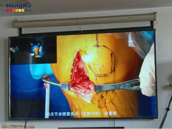 完成了膝關(guān)節(jié)單髁置換手術(shù)的教學(xué)直播。關(guān)節(jié)鏡的原畫面、手術(shù)操作的第一視角、手術(shù)室內(nèi)的全景視角通過軟件平臺(tái)傳遞給示教室,示教室可實(shí)時(shí)切換畫面并跟主刀醫(yī)生隨時(shí)語音溝通,達(dá)到實(shí)時(shí)講解答疑的效果。整個(gè)過程