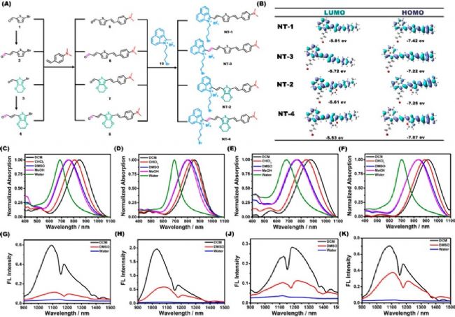通過選擇低電子密度受體(化合物10)和高電子密度給體(4-乙基- N, N -二甲基苯胺),并以噻吩為橋接結(jié)構(gòu),設(shè)計了探針NT-1的不對稱D-A結(jié)構(gòu)。NT-1的合成通過一個簡單的過程完成(圖1A)。合成反應(yīng)的產(chǎn)率為92%,與目前報道的NIR-II熒光探針相比,收率非常高。根據(jù)已報道的研究,采用屏蔽策略可以有效地提高NIR-II探針的QYs,這是由于共軛主鏈阻礙了分子間相互作用或阻止了聚集。據(jù)此,本文設(shè)計并合成了以EDOT取代噻吩的NT-2。EDOT作為第二給體和橋接基團具有扭曲分子骨架的作用,從而降低分子間的相互作用。NT-3和NT-4是通過延長雙鍵來獲得發(fā)射波長的紅移而得到的。NT-2、NT-3、NT-4的收率也較高,分別為92%、90%、91%。用1H NMR、13C NMR和質(zhì)譜對這4個化合物進行了表征,證實了結(jié)構(gòu)的正確性。