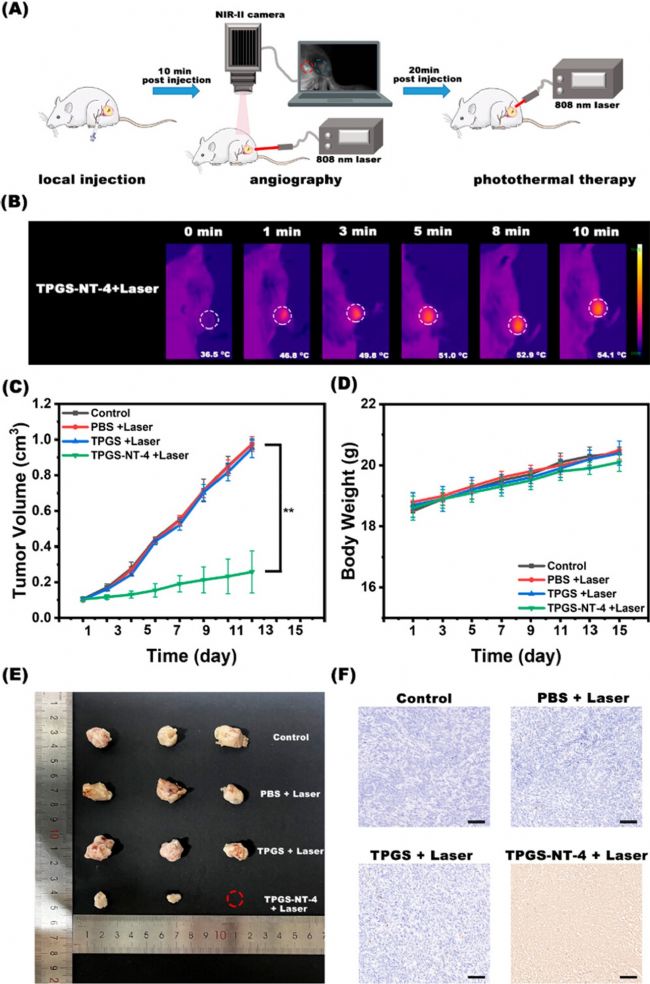 毫無疑問,將納米藥物有效地輸送到腫瘤組織,同時減少對正常組織的損傷是一項艱巨的挑戰(zhàn)。本研究通過結(jié)合血管造影和局部光熱治療來提高納米光熱劑對腫瘤的吸收,同時減少其對正常組織的損傷。在NIR-II熒光引導(dǎo)下局部注射TPGS-NT-4治療劑量,然后進行光熱治療。在輻照期間產(chǎn)生的健康組織損傷將大大減少。H&E染色證實了TPGS-NT-4 NPs具有良好的生物相容性。隨后,本文還研究了TPGS-NT-4 NPs的光熱性質(zhì)。實驗結(jié)果證實TPGS-NT-4 NPs具有良好的光熱隔熱性能和優(yōu)異的光熱穩(wěn)定性。體內(nèi)光熱治療實驗也進一步證實TPGS-NT-4 NPs具有開發(fā)用于局部治療的光熱劑的潛力。