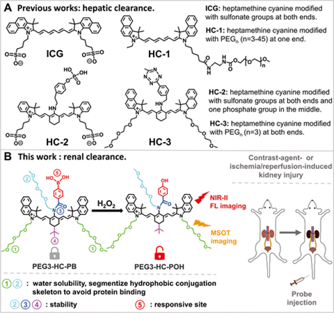 七甲基花菁類染料是一類重要的近紅外發(fā)色團,其較易于進行結構修飾以將其熒光拓展到NIR-II波段,且吸收系數(shù)高。但它們的長共軛結構和疏水性通常造成其無法被腎臟清除,從而限制了它們在腎臟疾病檢測和成像中的應用。過去的研究試圖通過在染料的兩端引入親水基團來改善這些染料的水溶性,但并不一定會使它們變成腎臟清除。例如,已被FDA批準用于臨床應用的吲哚青綠(ICG)是水溶性的,因為接合結構的兩側都引入了親水磺酸基,但它仍然是被肝臟清除,而不是被腎臟清除;這是因為中間的結合骨架仍然疏水,很容易與體內(nèi)的蛋白質(zhì)結合,導致形成的顆粒太大而不能被腎臟清除;采用PEGn(n=3−45)作為親水性基團也是如此,如方案1A所示。