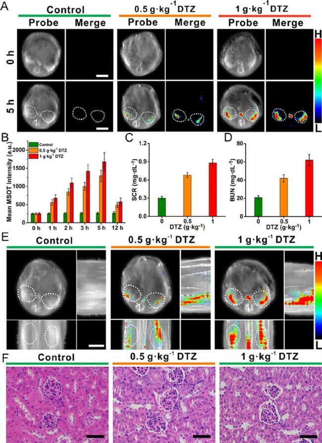 然后對各組小鼠的主要臟器進行MSOT成像。與其他器官相比,注射DTZ的模型鼠腎臟的MSOT信號要明顯得多。對不同組小鼠腎組織切片的進行組織學分析,圖3F中的H&E染色圖像顯示,與對照組(健康鼠)相比,模型組小鼠腎小管擴張和空泡化變性。DTZ高劑量組腎臟損害較低劑量組明顯加重,進一步證明造影劑確實對腎臟有損害,且隨著造影劑劑量的增加,腎損傷程度加重。