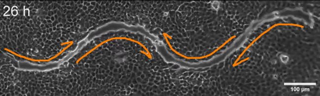 研究發(fā)現(xiàn),在波浪狀傷口上,細胞以一種渦旋式軌跡運動,可以比較快達到愈合,而直線傷口細胞嘗試渦旋式移動似乎會受制于其他細胞,最終呈現(xiàn)為幾乎平行于傷口的直線運動,運動方式的差異導致波浪狀傷口恢復(fù)速度幾乎是直線傷口的5倍。