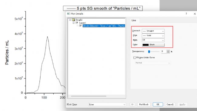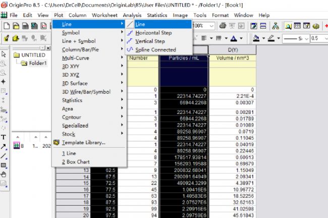 選中A列(粒徑)與C列(顆粒濃度),點擊工具欄中“Plot→Line→Line”,得到粒徑濃度圖。