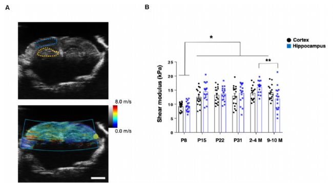 為了評(píng)估活體動(dòng)物腦組織的機(jī)械特性,我們首先將超聲的SWEI應(yīng)用于不同年齡的小鼠。ARF使用聚焦的超聲波束產(chǎn)生的剪切波傳播顯示了可靠和一致的結(jié)果,可以將剪切模數(shù)量化為包括人類和嚙齒動(dòng)物在內(nèi)的腦組織的體內(nèi)硬度。通過(guò)B模塊成像,我們確定了海馬區(qū)和大腦皮層區(qū)。然后,手動(dòng)確定ROI以計(jì)算剪切模數(shù)(如下圖)。