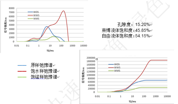 樣品的微分譜中可以看出來,飽錳樣中加入錳使水的弛豫時間變短,采集不到水的信號,只能采集到油的信號。從飽水樣的弛豫譜中可以得到孔隙度,束縛流體飽和度、自由流體飽和度,結(jié)合原始樣和飽錳樣弛豫譜可以得到含油飽和度和含水飽和度。