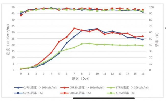研究培養(yǎng)的是CHO-K1細胞,分別完成了CUR5L、50L、500L的培養(yǎng)。結果顯示,在相同工藝下,CUR系列較傳統(tǒng)攪拌式反應器,在活率相當的情況下,細胞密度上提高了50%,繼而目的蛋白產量提高了40%。