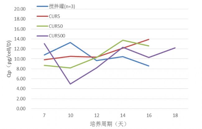在放大摸索研究發(fā)現,CUR5L、50L、500L的收罐活細胞密度積分IVCC分別提高了41%、53%和49%。同時,CUR的Qp值與傳統(tǒng)攪拌式反應器械維持在同等水平(10~11pg/cell/day)。這也意味著,CUR培養(yǎng)過程中,細胞累計數量增多,同時單個細胞的蛋白產量與攪拌式在同一水平。在維持同等Qp值條件下,提高IVCC,最終表達量就能大量提高,CUR5L、50L、500L分別提高了45%、45%和37%。