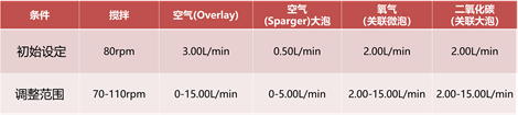 批次培養(yǎng)階段細胞培養(yǎng)階段設(shè)置溫度為37.0℃,蛋白表達階段通過夾套降溫至34.0℃,控制pH 6.95±0.1,DO約40%,體積依賴參數(shù)設(shè)置如下: