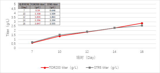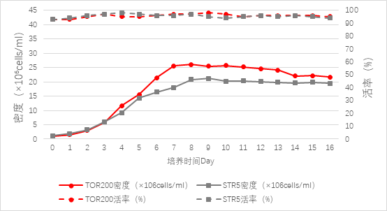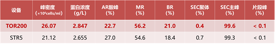 細胞表現(xiàn):TOR200反應(yīng)器與其他STR反應(yīng)器接種密度相近,培養(yǎng)結(jié)果顯示峰TOR密度達26.07X106cells/mL,較其他STR提高20%以上;細胞活率基本維持在95%-98%