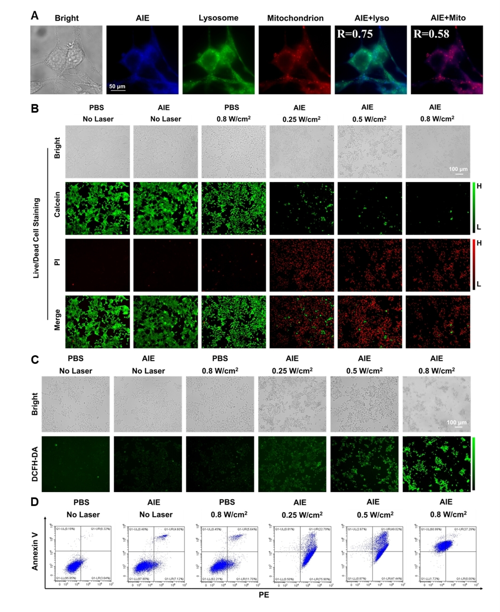 如圖3B顯示在AIE NPs孵育4小時(shí)后,激光照射4T1細(xì)胞10分鐘后,4T1細(xì)胞出現(xiàn)強(qiáng)烈的紅光發(fā)射,并且隨著激光功率密度的增加,4T1細(xì)胞中紅光發(fā)射的比例增加,這表明TPA-TTINNC NPs對癌細(xì)胞具有良好的光消融能力。